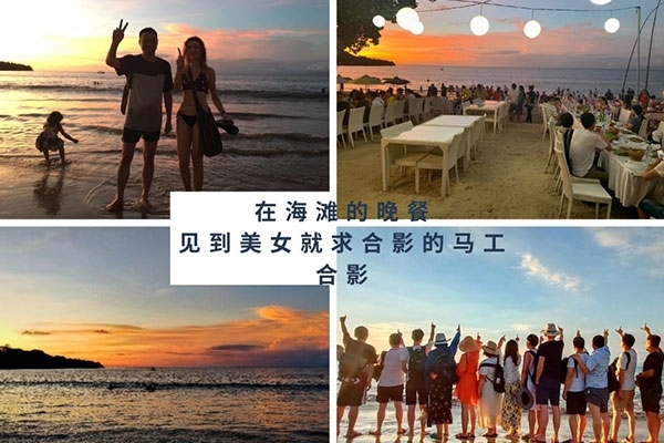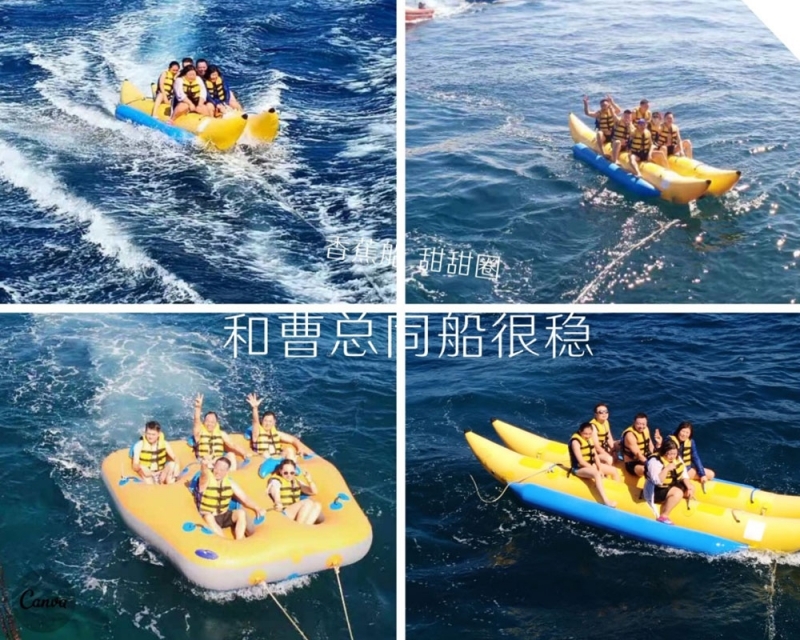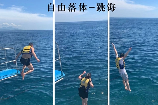 半小時后,我們首先到達了海中間由兩艘游輪搭建的漂浮“海上游玩基地”,除了“香蕉船”“甜甜圈”和“浮潛”這些項目,最有意思的是“跳?!?,作為非專業隊員,大家入水姿勢各異,激起巨大的浪花。遺憾的是,“女神”曹總并沒有參與“跳?!保烙嬎菫榇蠹抑?,怕入水海平面升高2米,淹沒“基地”,多年以后,我還是要感謝曹總的“不淹之恩”,讓我依然可以坐在在夕陽下回憶往昔。