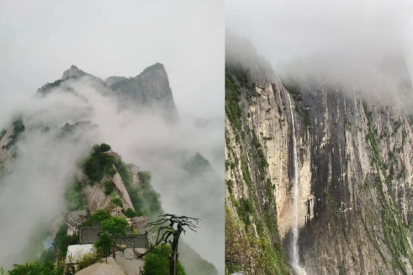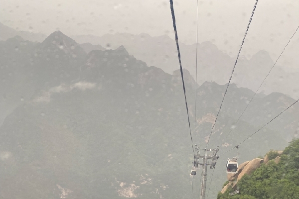 滑道后是西峰索道,因為雨水和霧氣,索道人員不斷的擦拭觀景玻璃。索道近20分鐘,纜車升高氣壓變化,耳朵有些耳鳴。隨著索道的升高,山盡收眼底,每個角度的都不一樣,透過玻璃和相機已無法拍出景色的美。山體像一塊垂直的峭壁,沒有任何起伏,因為接連下雨,雨水變成瀑布,1989年發行的《華山》特種郵票一模一樣。“幽深足暮蟬,驚覺石床眠。瀑布五千仞,草堂瀑布邊。壇松涓滴露,岳月泬寥天。鶴過君須看,上頭應有仙?!?